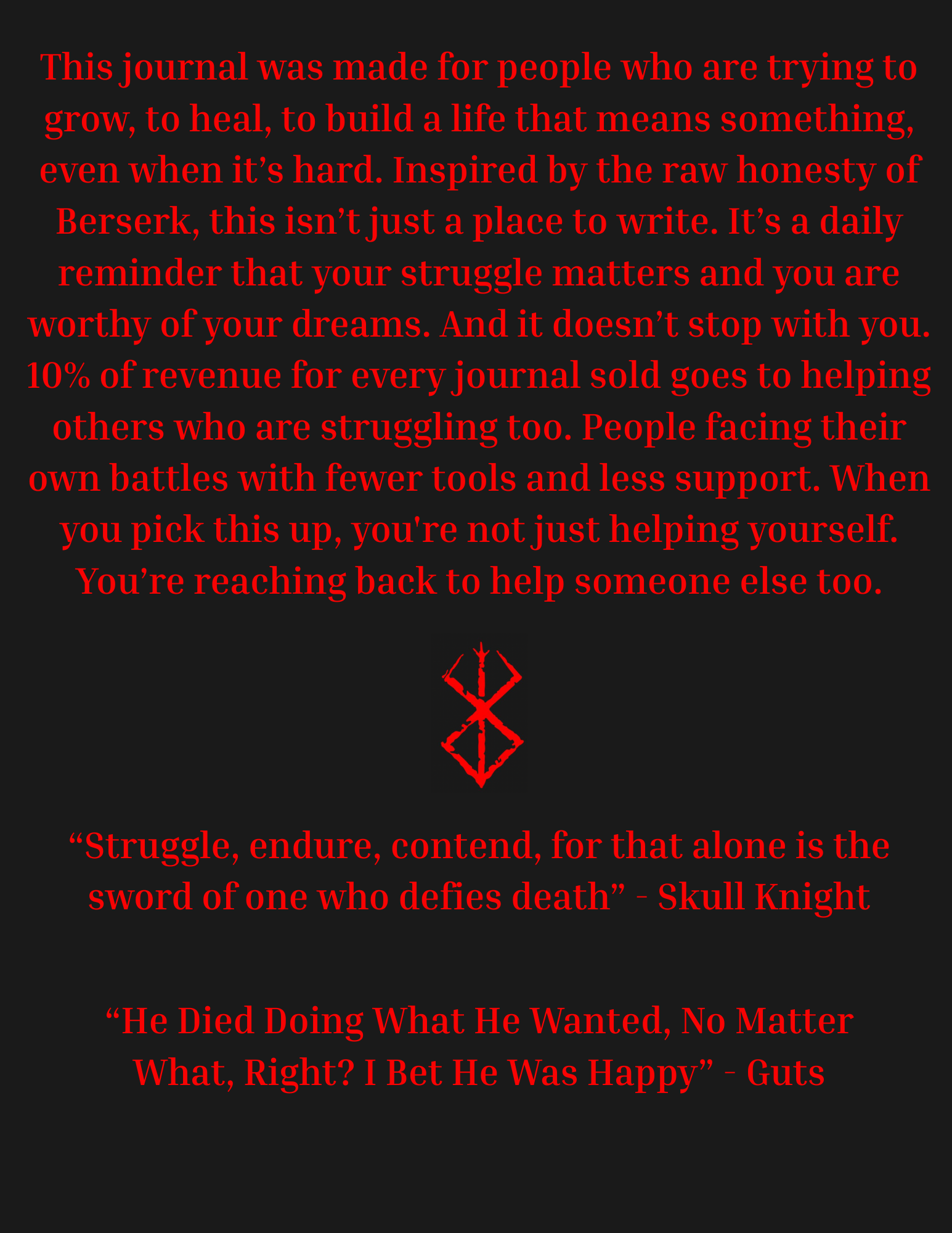 Crafted for those walking a path alone, yet not lost. Whether you're chasing discipline, healing old wounds, or shaping a vision worth waking up for — this journal becomes a mirror and a compass. There’s space here not just for goals, but for grit. No fluff. No filler. Just a quiet place to wrestle with the man or woman you’re becoming.